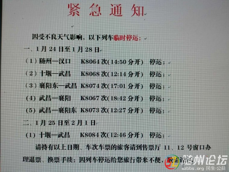因受不良天氣影響,以下列車臨時(shí)停運(yùn): 一、1月24日——1月28日 1、隨州——漢口 K8064次(14:50分開) 停運(yùn) 2、十堰——武昌 K8068次(12:14分開) 停運(yùn) 3、襄陽(yáng)東——武昌   ...
