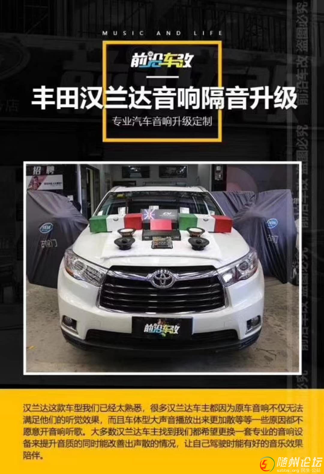 《豐田漢蘭達(dá)》漢蘭達(dá)這款車型我們已經(jīng)太熟悉,很多漢蘭達(dá)車主都因?yàn)樵囈繇懖粌H無法滿足他們的聽覺效果,而且車體型大聲音播放出來更加散等等一些原因都不愿意開音響聽歌。大多數(shù)漢蘭達(dá)車主找到我們都希望更換一套 ...