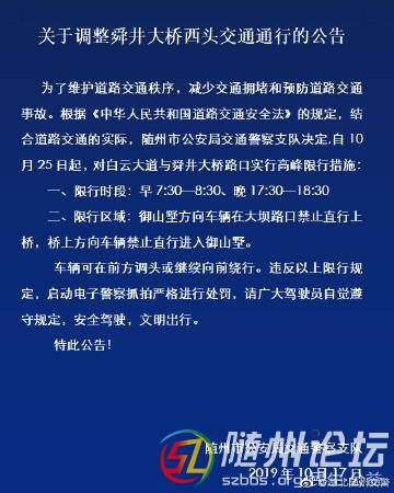 本帖最后由 隨州日報 于 2019-10-18 10:37 編輯 自2019年10月25日起,對隨州白云湖大道至舜井大橋路口實行高峰限行措施,對城區(qū)貨車部分限行區(qū)域作出調(diào)整。請大家互相轉(zhuǎn)告,自覺遵守規(guī)定,安全駕駛,文明出行。 ...