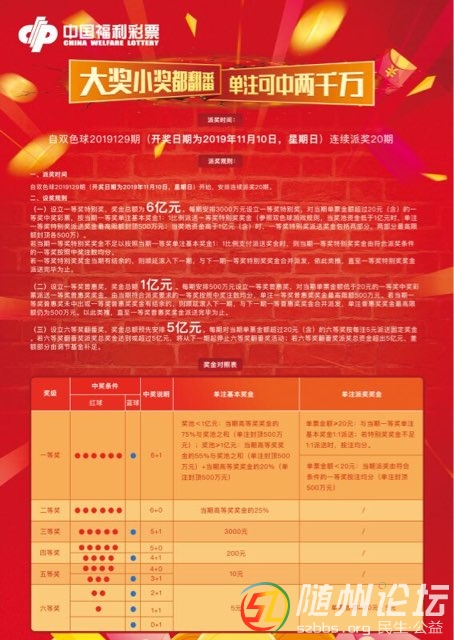正文摘要:派獎(jiǎng)時(shí)間: 自雙色球2019129期(開(kāi)獎(jiǎng)日期為2019年11月10日,星期日)連續(xù)派獎(jiǎng)20期 派獎(jiǎng)規(guī)則: 一、派獎(jiǎng)時(shí)間 自雙色球2019129期(開(kāi)獎(jiǎng)日期為2019年11月10日,星期日)開(kāi)始,安排連續(xù)派獎(jiǎng)20期。 二、設(shè)獎(jiǎng)規(guī)則 (一)設(shè)立一 ... |