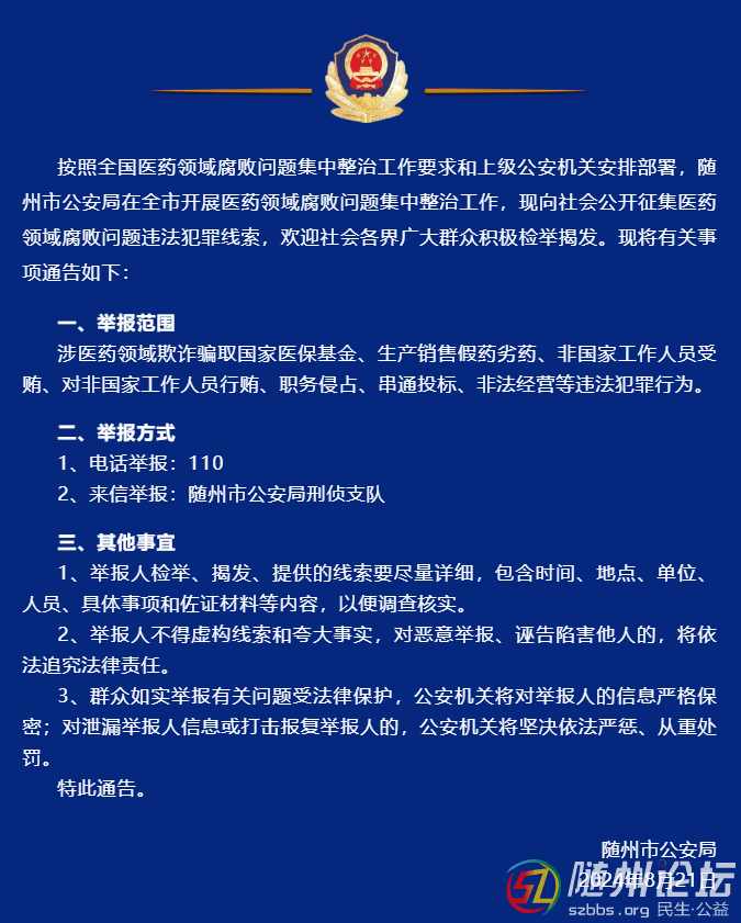 隨州市公安局:關于公開征集醫(yī)藥領域腐敗問題違法犯罪線索的通告 & R& d, S" W8 E! h8 ]$ y ' E: c, d6 [5 H9 J1 k