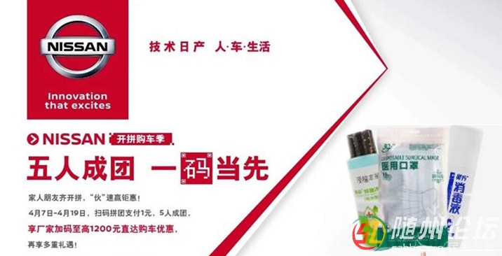 五人成團 一碼當先 NISSAN開拼購車季 4月18日-4月19日 廠家直銷團購會 超值五重禮等你來 1繳納誠意金且在當天到店客戶送東風日產原廠雨傘一把2提前繳納誠意金抵交強險一份活動期間購100元券并到店購車 即享交強險一份