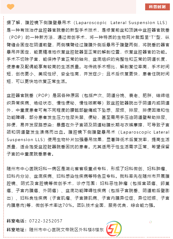 在女性的健康世界里,有一個(gè)常常被忽視卻至關(guān)重要的問題——盆底功能障礙。它如同一個(gè)隱匿的“生活破壞者”,嚴(yán)重影響著眾多女性的生活質(zhì)量。今天,我們就來聊聊守護(hù)女性盆底健康的得力助手——腹腔鏡下側(cè)腹壁懸吊術(shù)(Laparoscopic Lateral Suspension  LLS)。