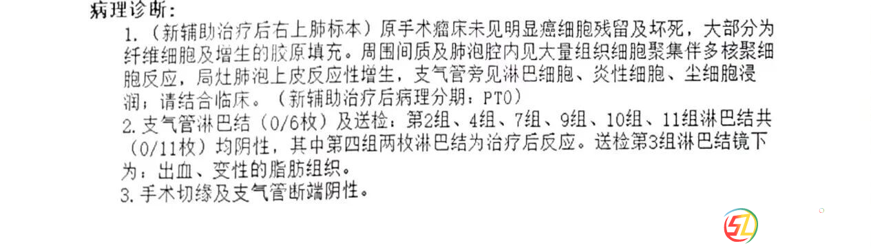 手術(shù)當(dāng)天,彭均偉醫(yī)師團(tuán)隊(duì)?wèi){借豐富的胸腔鏡手術(shù)經(jīng)驗(yàn),先處理好肺部的血管和支氣管,再仔細(xì)分離粘連區(qū)域,成功切除了右上肺葉,并清掃了周圍的淋巴結(jié)。術(shù)后病理結(jié)果帶來了更大的驚喜:腫瘤細(xì)胞已經(jīng)完全消失,連之前轉(zhuǎn)移的淋巴結(jié)也轉(zhuǎn)為陰性!這意味著羅大爺通過“轉(zhuǎn)化治療+手術(shù)”的新模式,達(dá)到了病理學(xué)上的完全緩解。