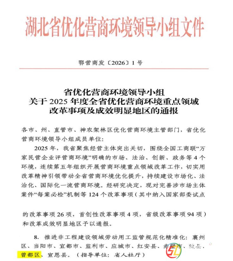 全省通報表揚 曾都優(yōu)化營商環(huán)境工作再獲殊榮近日,湖北省優(yōu)化營商環(huán)境領(lǐng)導小組印發(fā)《關(guān)于2025年度全省優(yōu)化營商環(huán)境重點領(lǐng)域改革事項及成效明顯地區(qū)的通報》(鄂營商發(fā)〔2026〕1號),對全省124項重點領(lǐng)域改革事項和 ...